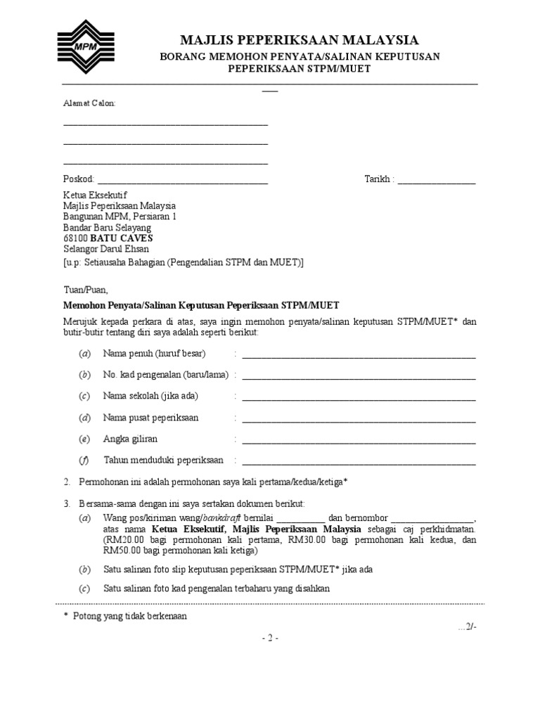 Pegawai peperiksaan (tetap/kontrak) dg41 5 kekosongan jawatan. Majlis peperiksaan malaysia (mpm) yang ditubuhkan pada 1 februari 1980 di bawah akta majlis peperiksaan malaysia akta 225 ialah sebuah badan berkanun yang beroperasi di bawah naungan kementerian pelajaran malaysia. Posted jan 16, 2017, 5:14 pm by unknown user updated jan 16, 2017, 6:00 pm . Pengajian am 4 (900/4) borang perakuan calon borang ini mestilah ditandatangani oleh calon dan guru/pemeriksa. 90 minit 90 minit 30 minit.